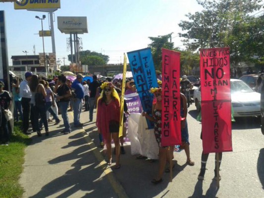 Mujeres de diferentes organizaciones femeninas participan de la actividad en la primera calle de la ciudad, llegarán al parque central donde realizarán actos símbolicos para reclamar justicia por centenares de mujeres que han perdido la vida en Honduras de forma violenta.