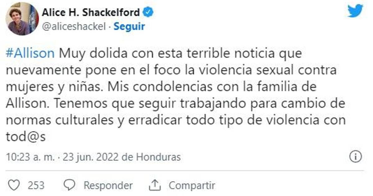 “Muy dolida con esta terrible noticia que nuevamente pone en el foco la violencia sexual contra mujeres y niñas. Mis condolencias con la familia de Allison. Tenemos que seguir trabajando para cambio de normas culturales y erradicar todo tipo de violencia con tod@s”, publicó Shackelford en su cuenta de Twitter.