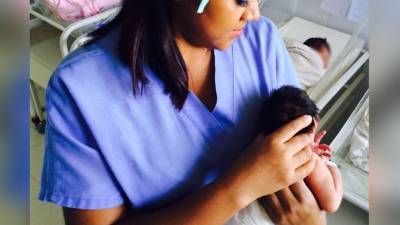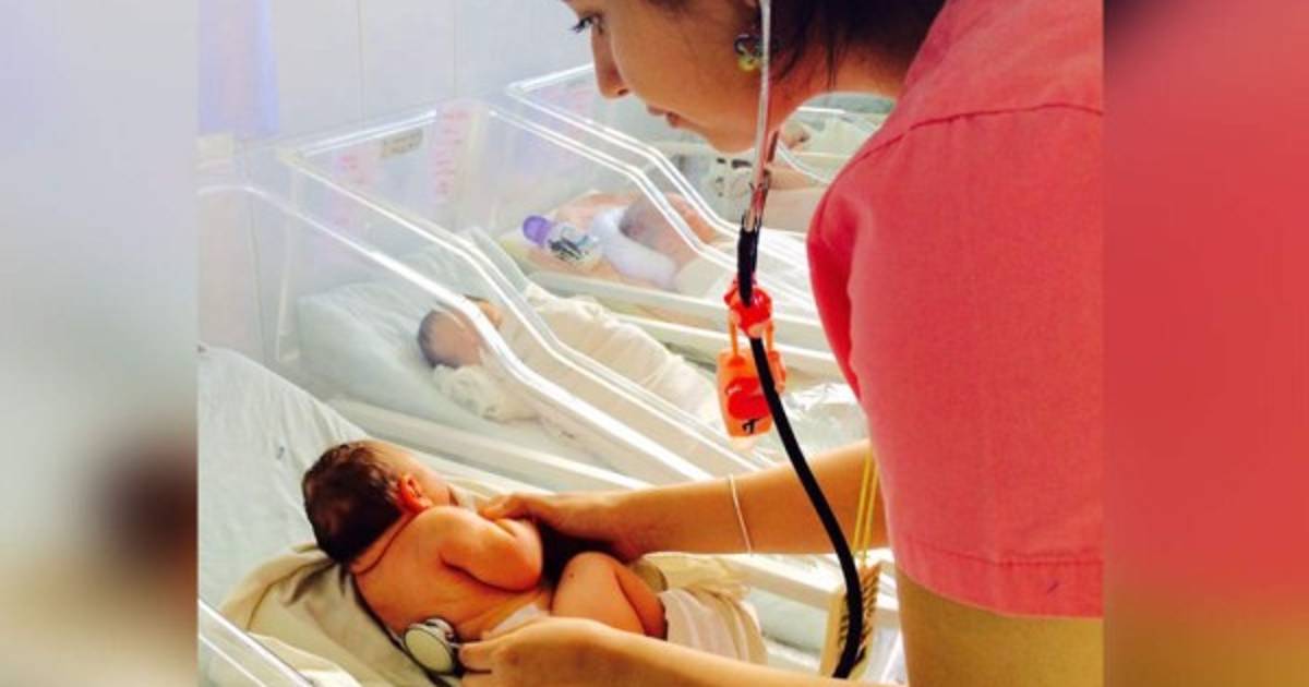 Una enfermera carga a uno de los bebés en brazos.
