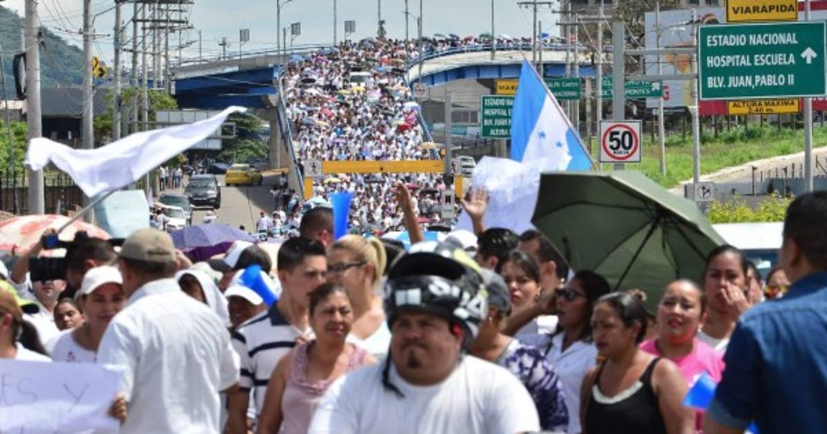 Unos 8.000 manifestantes, convocados por el Partido Nacional (PN, derecha) a la 'marcha de la paz', caminaron un kilómetro en Tegucigalpa, desde las cercanías del Estadio Nacional hasta la sede del Colegio Médico de Honduras (CMH).