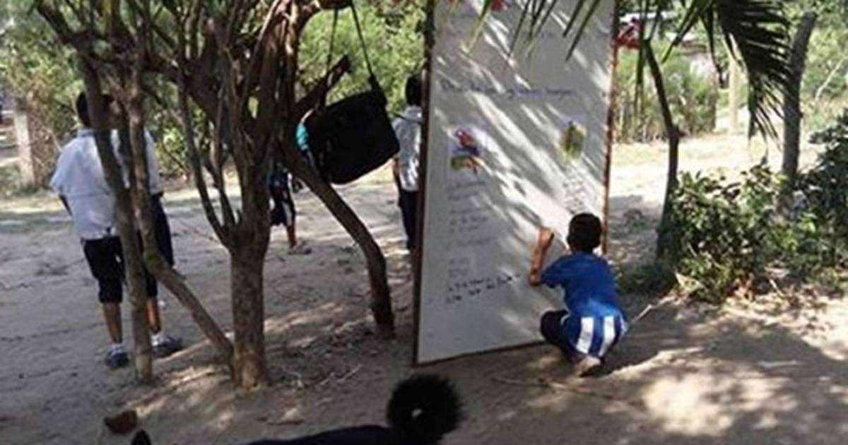 Los niños de la escuela sampedrana recibiendo clases debajo de un árbol.