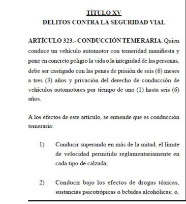Las nuevas disposiciones están en el artículo 323 del Código Penal donde se establece como conducción temeraria: 'Quien conduce un vehículo automotor con temeridad manifiesta y pone en concreto peligro la vida o la integridad de las personas, debe ser castigado con las penas de prisión de seis (6) meses a tres (3) años y privación del derecho de conducción de vehículos automotores por tiempo de uno (1) hasta seis (6) años.