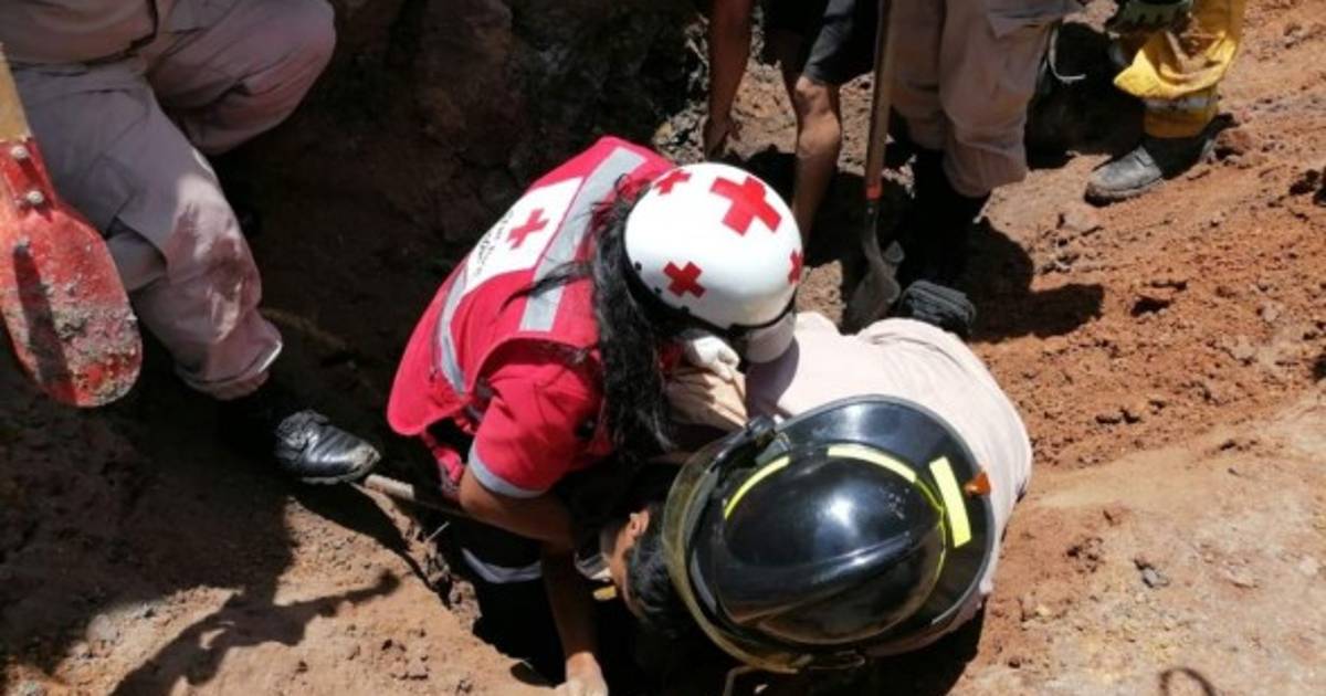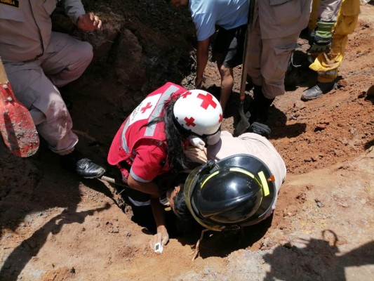 Sus extremidades permanecían bajo tierra, mientras oficiales bomberiles realizaban trabajos de rescate, entre las altas temperaturas (37 grados centígrados).