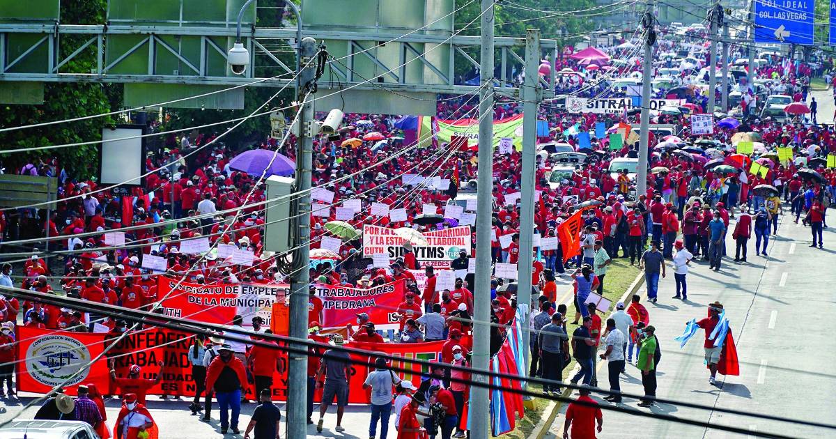 Las distintas organizaciones sindicales del valle de Sula se reunieron desde las 7:00 am en la primera calle, frente a Megamall, y a las 8:00 am iniciaron su camino hacia la Plaza de las Banderas, ubicada al lado del estadio Francisco Morazán.