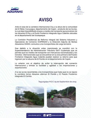 Incomunicadas se encuentran las fronteras de El Salvador y Guatemala, el departamento de Ocotepeque y el sur de Copán debido a que se hundió un tramo de la carretera internacional.