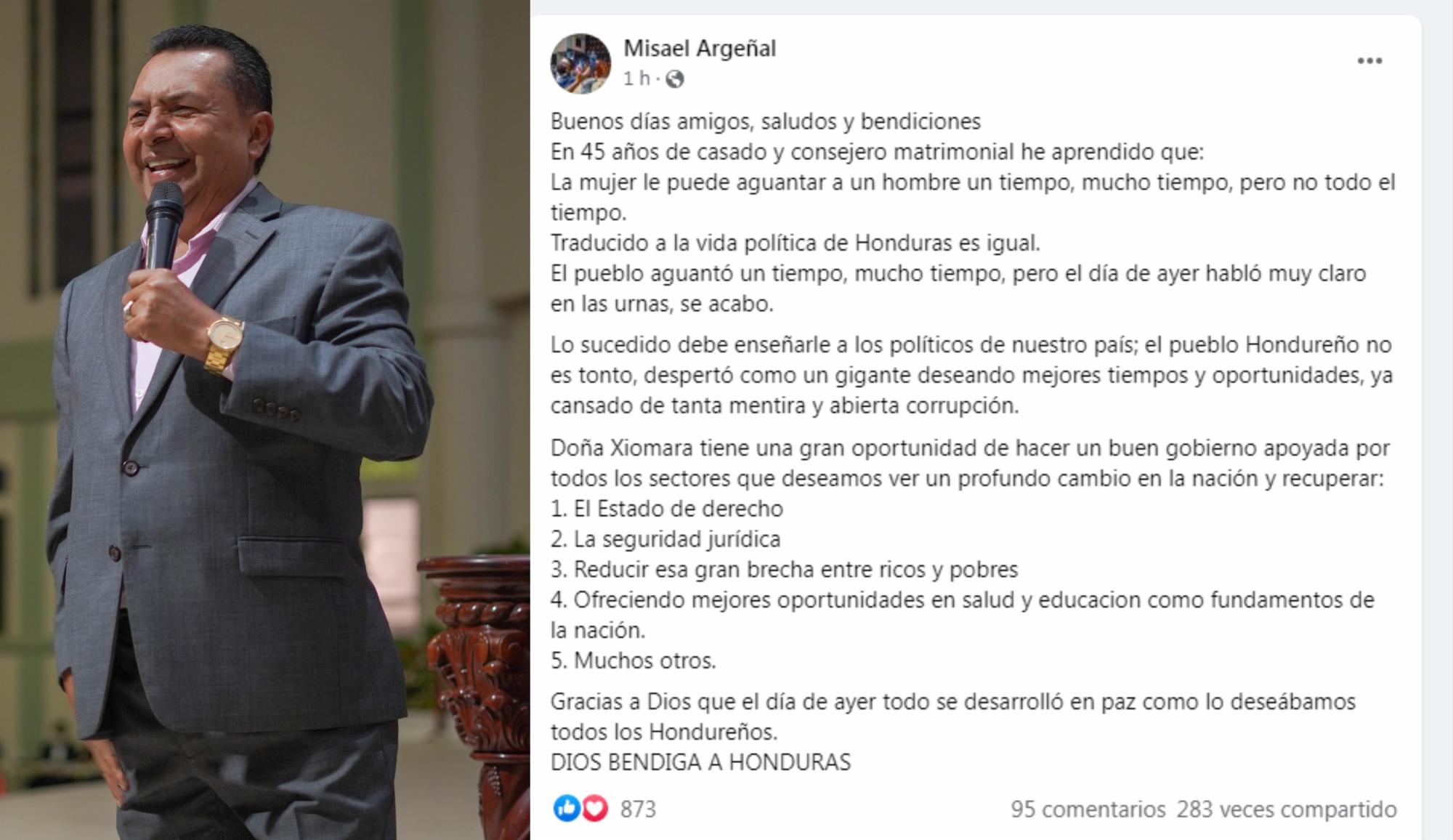 El pastor evangélico Misael Argeñal se unió al júbilo que embarga a miles de hondureños y escribió un mensaje en sus redes sociales en el que mostró su postura ante los primeros resultados de las elecciones generales 2021.