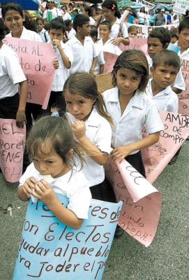 Niños, jóvenes y adultos protestaron hoy en el centro de San Pedro Sula condenando el abuso en los cobros de la Enee y el alto costo de la canasta básica familiar.