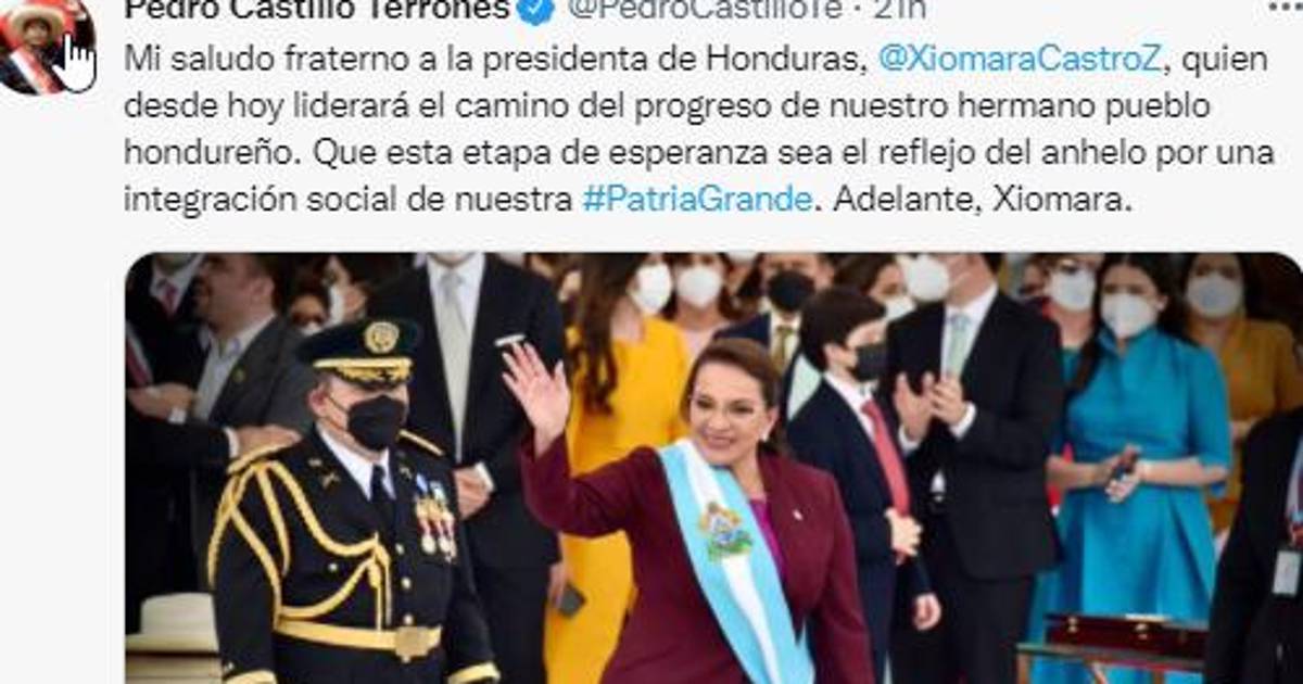”Mi saludo fraterno a la presidenta de Honduras, Xiomara Castro, quien desde hoy liderará el camino de progreso de nuestro hermano pueblo hondureño”, escribió en Twitter Castillo.
