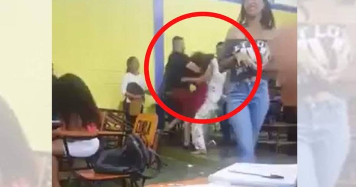 En el material se observa como de manera infraganti otra persona dentro del salón graba el momento en que dos jóvenes, una de vestido rosa y la otra de pantalón con blusa a rayas, están enfrentándose lejos de donde está filmando.