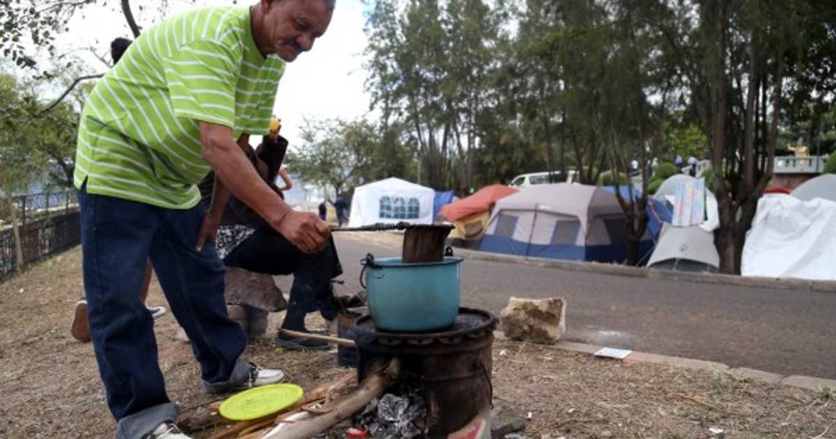Con un pequeño fogón improvisado con algunas piedras y en una lata de leche, una familia espera en las afueras del Santuario de Suyapa un poco de café que el abuelo José Martínez prepara a sus nietos para que disfruten con un pedazo de pan.