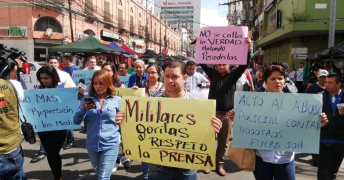 El gremio periodístico en la zona norte de Honduras realiza una protesta en el centro de la ciudad de San Pedro Sula condenando el uso excesivo de la fuerza de los agentes policiales contra un camarógrafo, quien resultó con heridas en su rostro mientras daba cobertura a una manifestación.