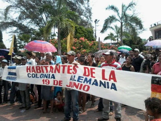 Los vecinos de la colonia Alemania realizan una manifestación esta mañana frente ala Municipalidad para exigir la inscripción del patronato de esa zona y evitar que no los desalojen de sus tierras, pues la alcaldía aduce que es predio municipal.