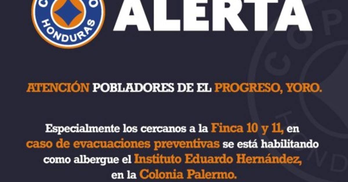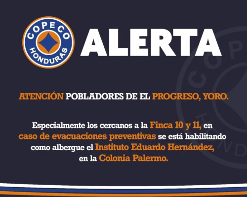Copeco alerta a los pobladores de El Progreso, Yoro, especialmente a los cercanos a la Fincas 10 y 11, en caso de evacuaciones preventivas se está habilitando como albergue el Instituto Eduardo Hernández, en la colonia Palermo.