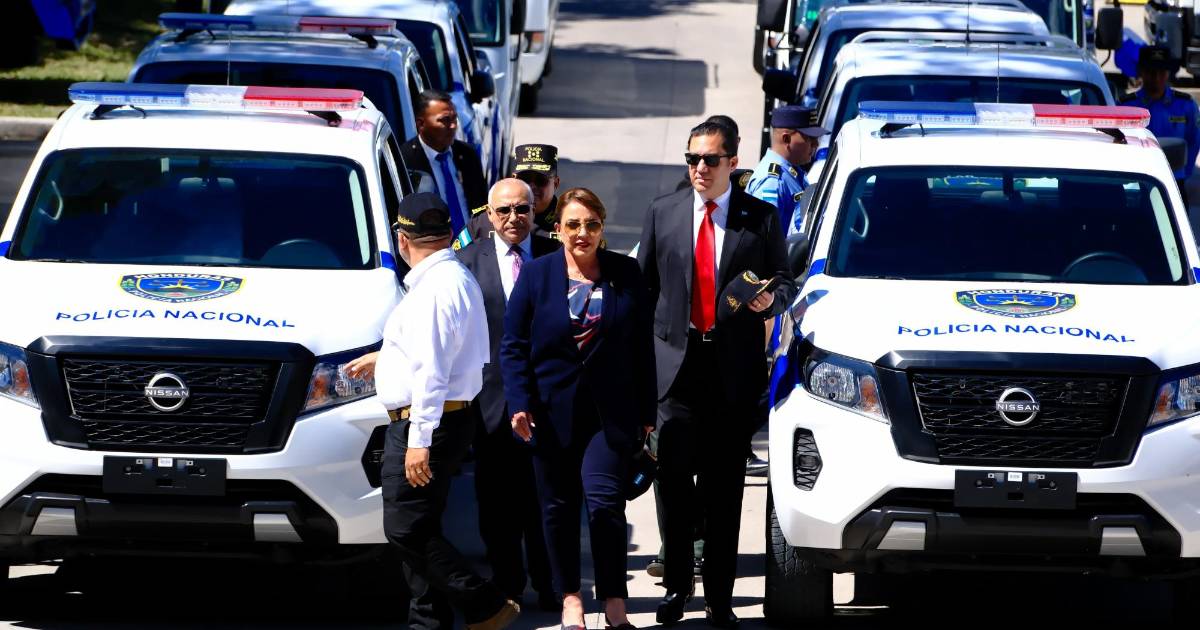 Xiomara Castro participó esta mañana en la entrega de 66 vehículos a la Policía Nacional.