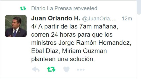 'A partir de las 7:00 am del lunes, corren 24 horas para que los ministros Jorge Ramón Hernandez, Ebal Diaz y Miriam Guzmán planteen una solución', manifestó el presidente en su cuenta en Twitter en donde agregó que 'desde que iniciamos el gobierno dijimos que necesitábamos una gestión por resultados y no es fácil enfrentar la complejidad de la aduanas'.