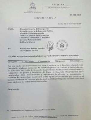 La Secretaría de Finanzas ordenó por instrucciones del presidente Juan Orlando Hernández no iniciar ningún trámite ni desembolso de solicitudes del Fondo de Desarrollo Departamental al que tienen acceso los diputados.