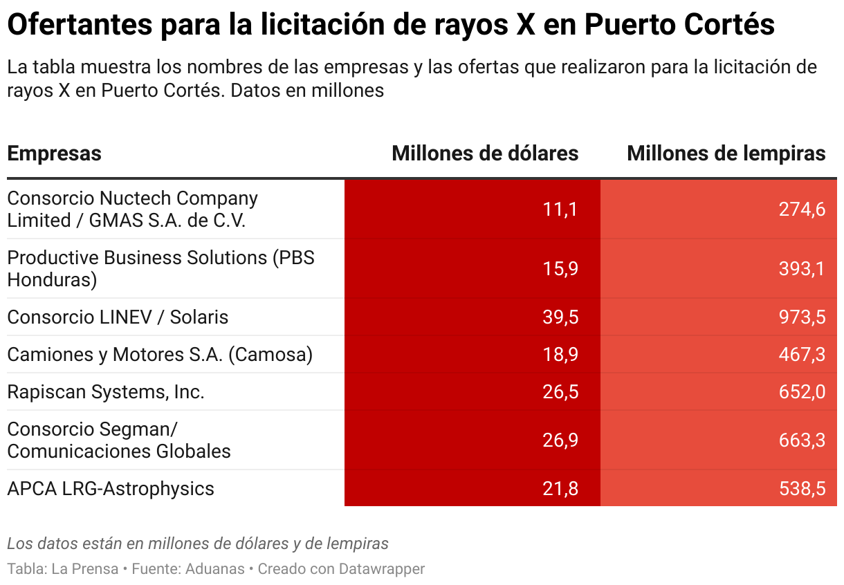 En la apertura de ofertas, siete empresas presentaron propuestas. La más baja fue la del consorcio chino Nuctech, con un monto de $11,162,816.67, mientras que otras compañías de capital estadounidense y europeo, como Productive Business Solutions, Rapiscan Systems y APCA LRG-Astrophysics, ofrecieron montos que oscilaban entre 15.9 millones y 39.5 millones de dólares.