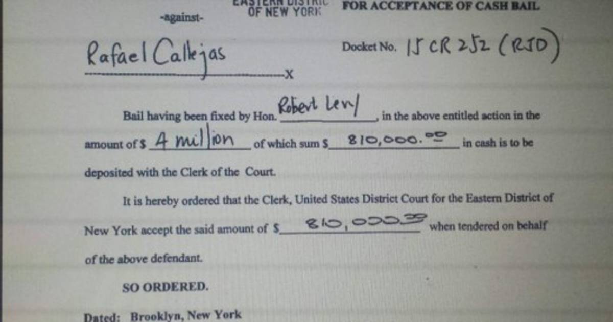 El expresidente de Honduras Rafael Callejas tiene hasta el próximo viernes 26 de febrero de 2016 para terminar de pagar la fianza de 810 mil dólares, de los cuales todavía tiene pendientes 100 mil, para seguir defendiéndose en libertad.