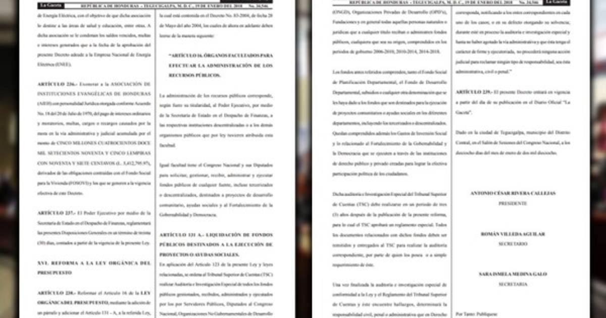 En aplicación del Artículo 123 de la presente Ley y leyes relacionadas, se ordena al Tribunal Superior de Cuentas (TSC) realizar Auditoría e Investigación Especial de todos los fondos públicos gestionados, recibidos, administrados y ejecutados por los por Servidores Públicos, Diputados al Congreso Nacional, Organizaciones No Gubernamentales de Desarrollo (ONGD), Organizaciones Privadas de Desarrollo (OPD’s), Fundaciones y en general todas aquellas personas naturales o jurídicas que a cualquier título reciban o administren fondos públicos, cualquiera que sea su origen, comprendidos en los períodos de gobierno 2006-2010, 2010-2014, 2014-2018.