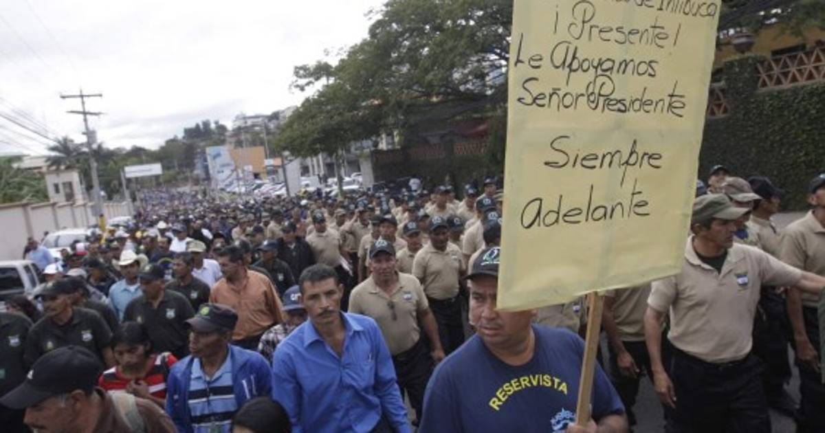 Los exmilitares protagonizaron una concurrida movilización en Plaza Democracia de Casa de Gobierno, adonde llegaron a ofrecer su respaldo al presidente Juan Orlando Hernández.