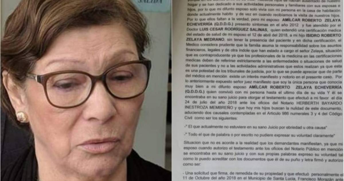 El documento explica que sus hijos pretenden anular el testamento que le dejó su esposo Amílcar Roberto Zelaya Echeverría haciéndose valer por el dictamen de un médico que establecía que este padecía alzheimer y se consideraba 'prudente que la familia asuma la responsabilidad sobre los asuntos financieros, legales y de otra índole'.
