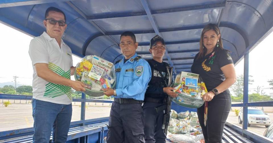 Don Roger D. Valladares a través de UTH y COFISA ha donado esta mañana 100 canastas básicas para agentes que se vieron afectados por las inundaciones se suman también las empresa IMSA y DIECK logrando recolectar entre las cuatro instituciones más de 3000 libras entre alimentos y agua purificada mismas que son trasladadas por la Policía a la capital del país para posteriormente movilizarlas a la Moskitia.