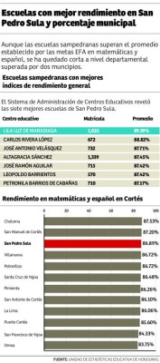 Según las estadísticas de rendimiento académico del Sistema de Administración de Centros Educativos (Sace), los estudiantes de San Pedro Sula ocupan el tercer lugar en rendimiento general en todo el departamento con un promedio de 86.89% cuando en 2013 tenían el promedio más alto en matemáticas y español.