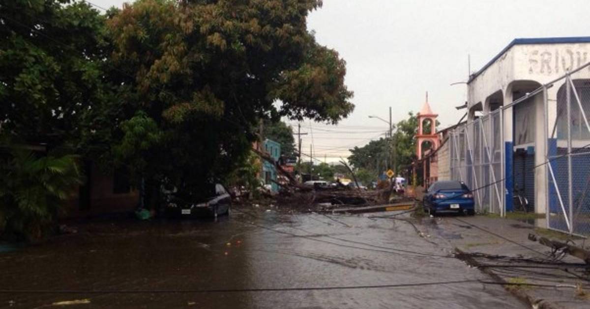 Árboles caídos, carros varados, calles inundadas, techos despegados y postes del tendido eléctrico en el suelo dejó este lunes una tormenta con vientos huracanados en San Pedro Sula, zona norte de Honduras.