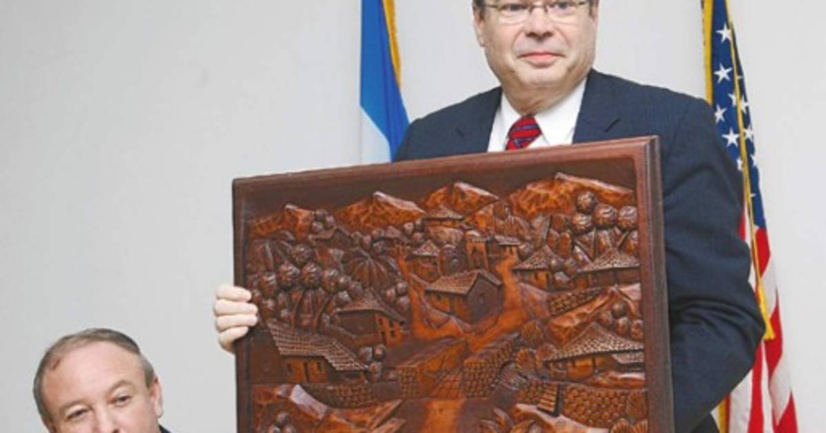 El primero fue un cuadro de madera de caoba tallado a mano por un artesano de Valle de Ángeles que simboliza el pueblo tradicional de Honduras.