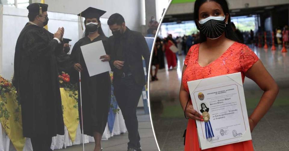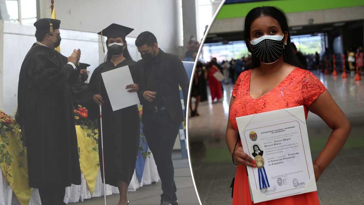 La joven se graduó este día de la Universidad Nacional Autónoma de Honduras (Unah) en la carrera de Letras con Orientación en Lingüística, a pesar de no contar con el sentido de la visión desde pequeña.