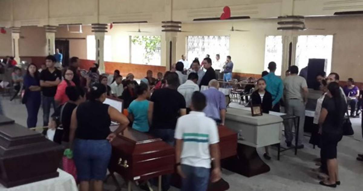 Algunas de las víctimas están siendo veladas en el salón del reino de los Testigos de Jehová en la colonia San Carlos de Sula de en San Pedro Sula.