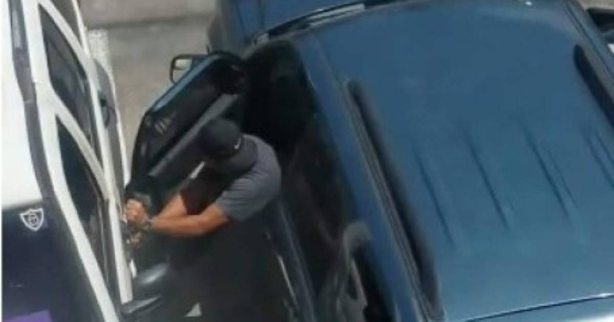 Tras varios intentos el delincuente logra abrir la puerta del carro y sacar un maletín negro que se presume contiene una computadora.