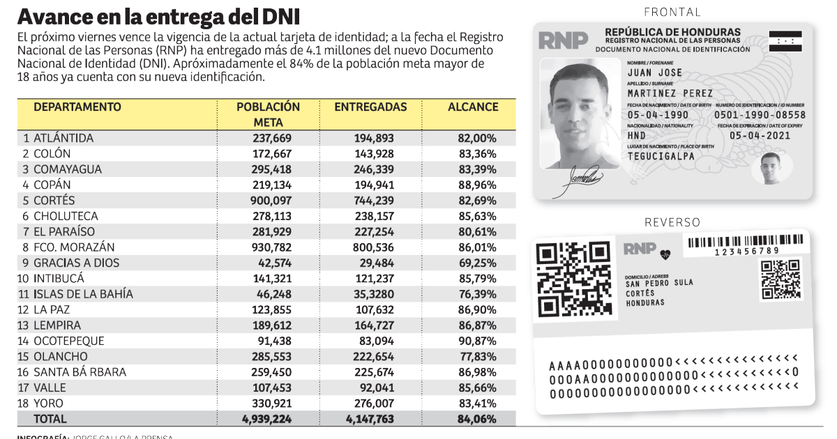 Conforme a los datos del Registro Nacional de las Personas (RNP), del total de la población meta (que son más de 4.9 millones ciudadanos) al 84% ya se le entregó la nueva identificación; el 16% restante representa casi 800,000 personas que aún no tienen el documento.