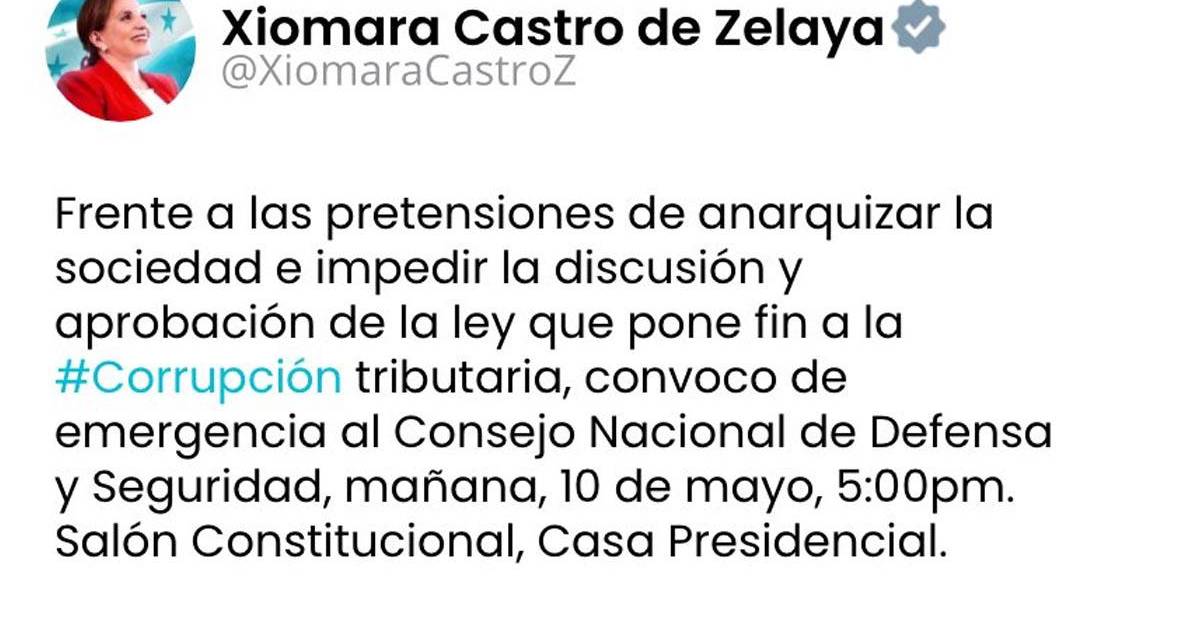 “Frente a las pretensiones de anarquizar la sociedad e impedir la discusión y aprobación de la ley que pone fin a la corrupción tributaria, convoco de emergencia al Consejo Nacional de Defensa y Seguridad, mañana, 10 de mayo, 5:00 pm. Salón Constitucional, Casa Presidencial”, escribió la mandataria hondureña en Twitter.