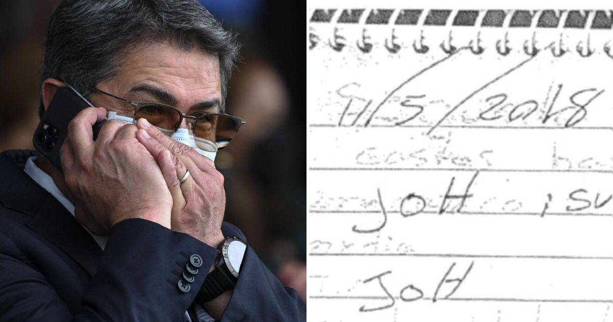 Juan Orlando Hernández, expresidente de Honduras, y una hoja de narcolibreta en la que aparecen sus iniciales.