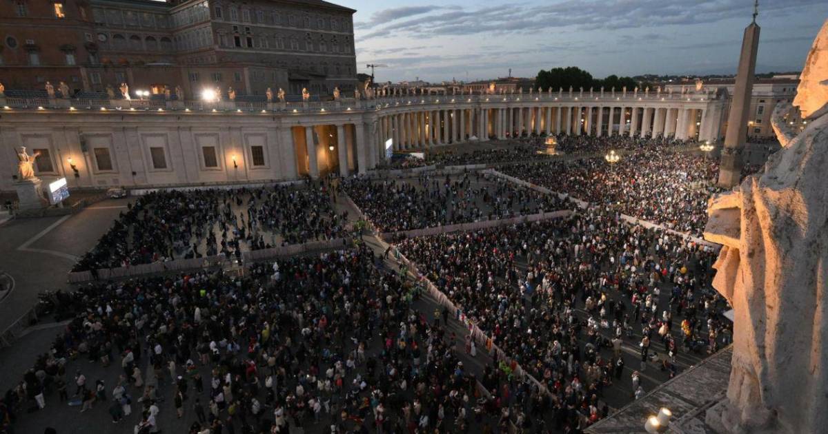 Según la Jefatura de Policía de Roma, alrededor de 10.000 personas se reunieron en la plaza, pendientes de la chimenea de la que salió la humareda negra procedente de la Capilla Sixtina, donde los 133 cardenales electores están encerrados para elegir al sucesor del difunto papa Francisco.