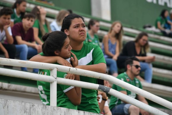 Los aficionados lloran durante realizan la oración y otros brindan un fuerte aplauso en memoria de las víctimas del fatal accidente.