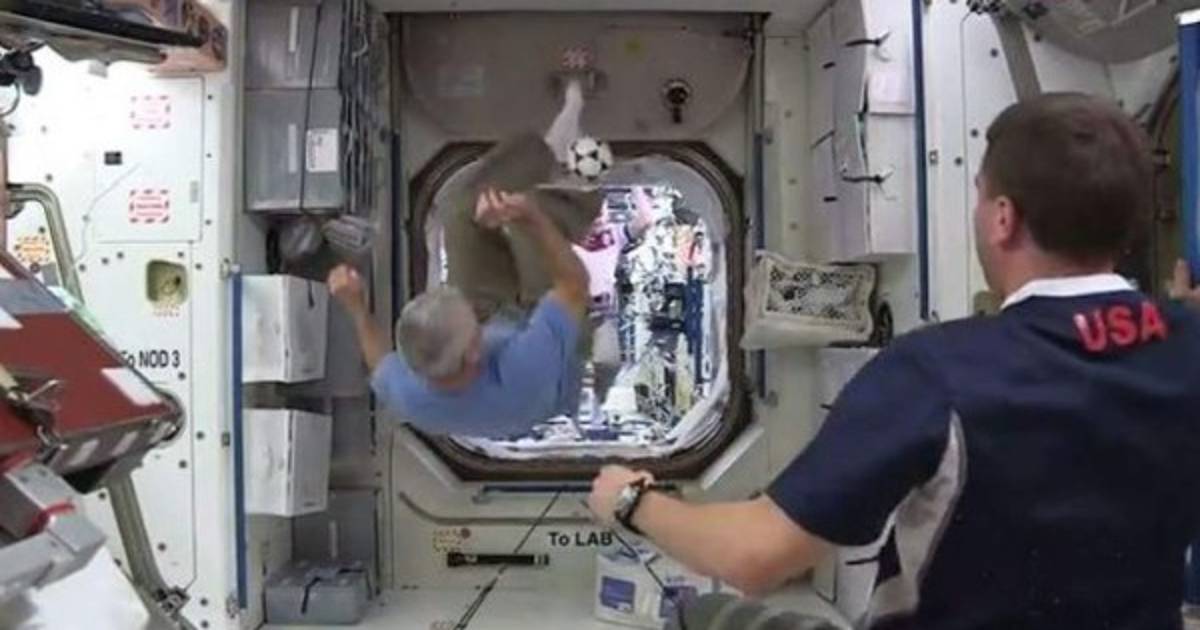 La ISS, a unos 400 kilómetros de altura sobre la superficie de la Tierra, da una vuelta completa al planeta cada hora y media, a unos 28,000 kilómetros por hora. Dentro, los astronautas dan patadas al balón, en calcetines, como suelen estar en la ISS. La base orbital, por cierto, tiene el tamaño aproximado de un campo de fútbol.