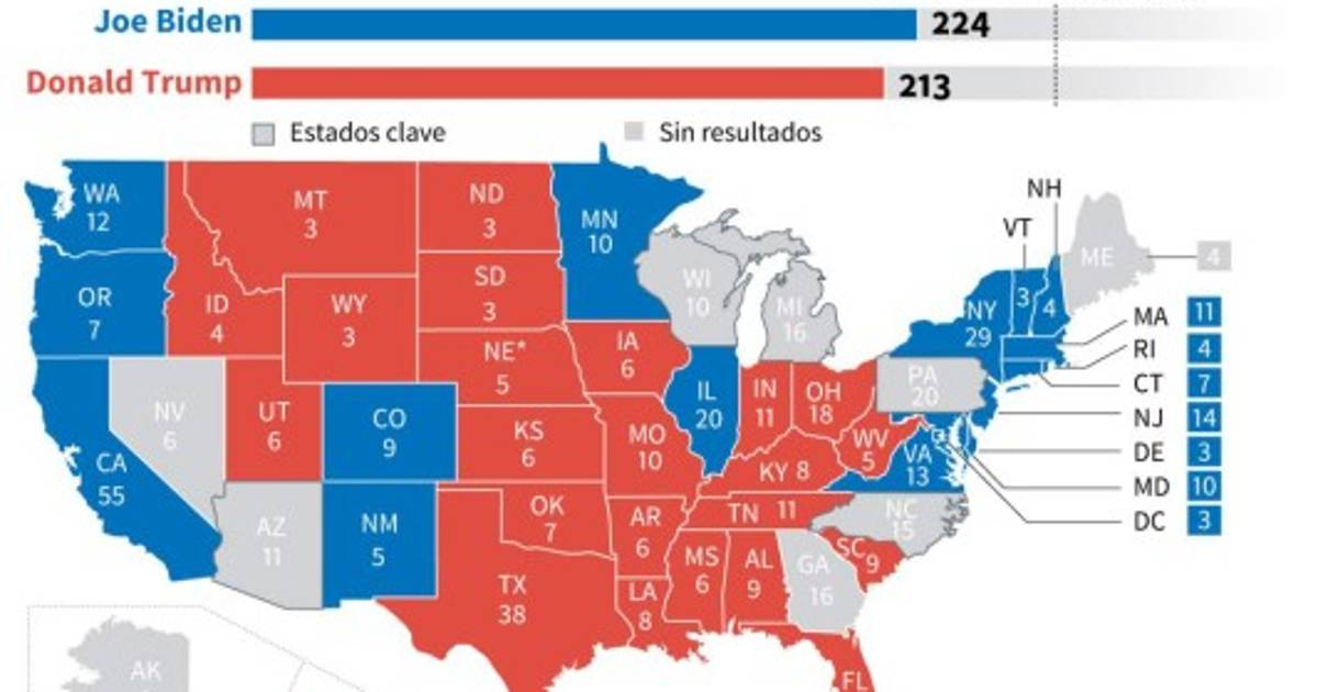 Las cadenas CNN y Fox News proyectaron estos tres estados que son bastiones demócratas, mientras que The New York Times y Fox News le dieron Idaho al presidente, Donald Trump.