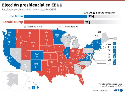 Con estos estados Biden amplía su ventaja en el recuento con 209 compromisarios asegurados en el Colegio Electoral frente a 119 de Trump, en su objetivo de llegar a los 270 que dan la victoria.