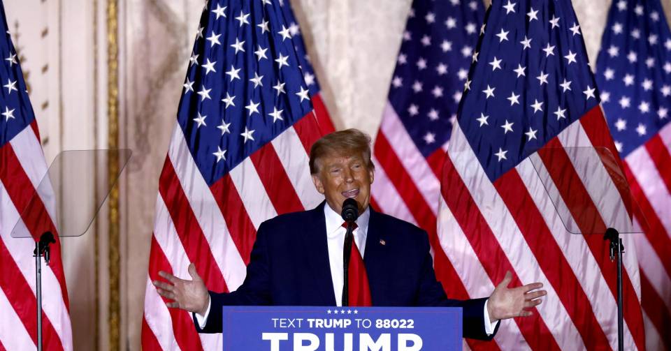 Para lanzar su nueva candidatura presidencial, Donald Trump preparó todo hasta en el más mínimo detalle: una fila de enormes banderas estadounidenses, un gran salón con columnas y activistas de renombre sentados en sillas doradas pero la nota saliente del acto fueron las ausencias.