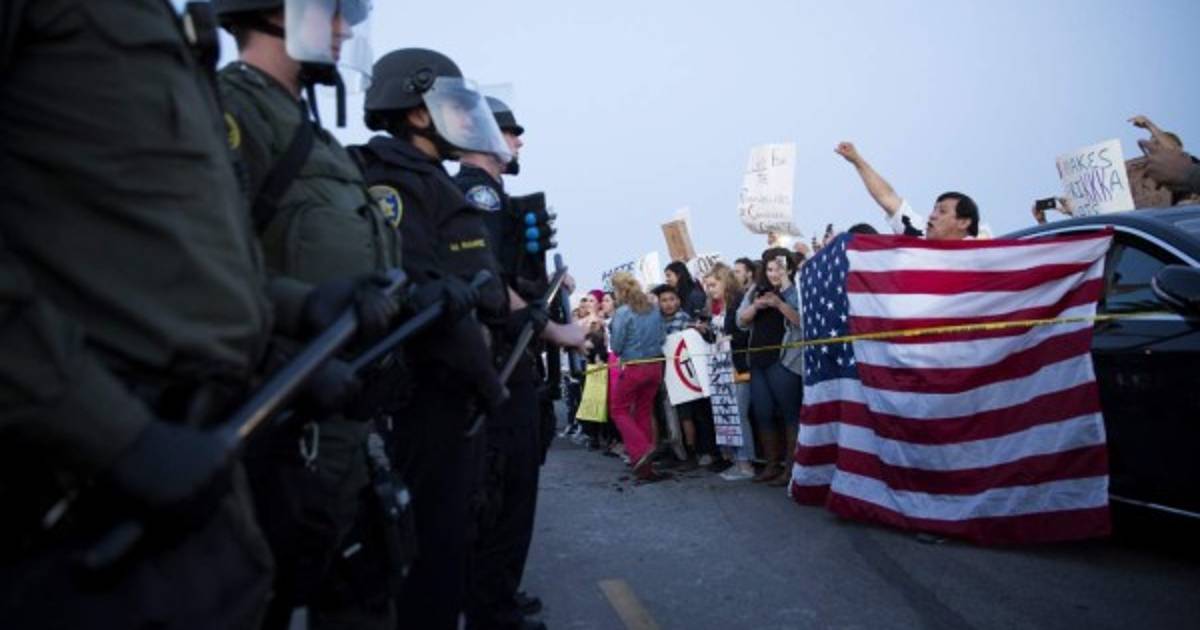 Cientos de manifestantes se enfrentaron a la policía en el exterior del anfiteatro de la ciudad de Costa Mesa, en el condado de Orange (al sur de Los Ángeles), durante un acto de la campaña de Trump, informó el diario Los Angeles Times.