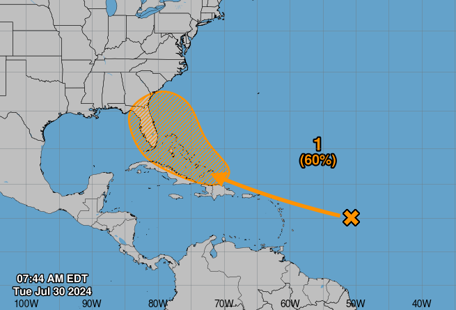 La perturbación cuenta con una probabilidad media (60 %) de convertirse en un sistema ciclónico en los próximos siete días, informa el centro meteorológico, con sede en Miami.