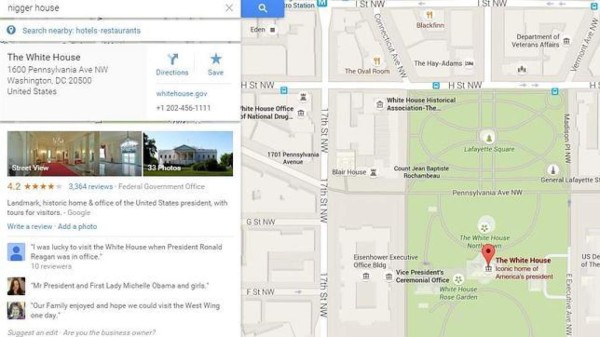 Al 'googlear' la ubicación nigger house o casa del negro, la dirección de Google maps conduce directo a la Casa Blanca.