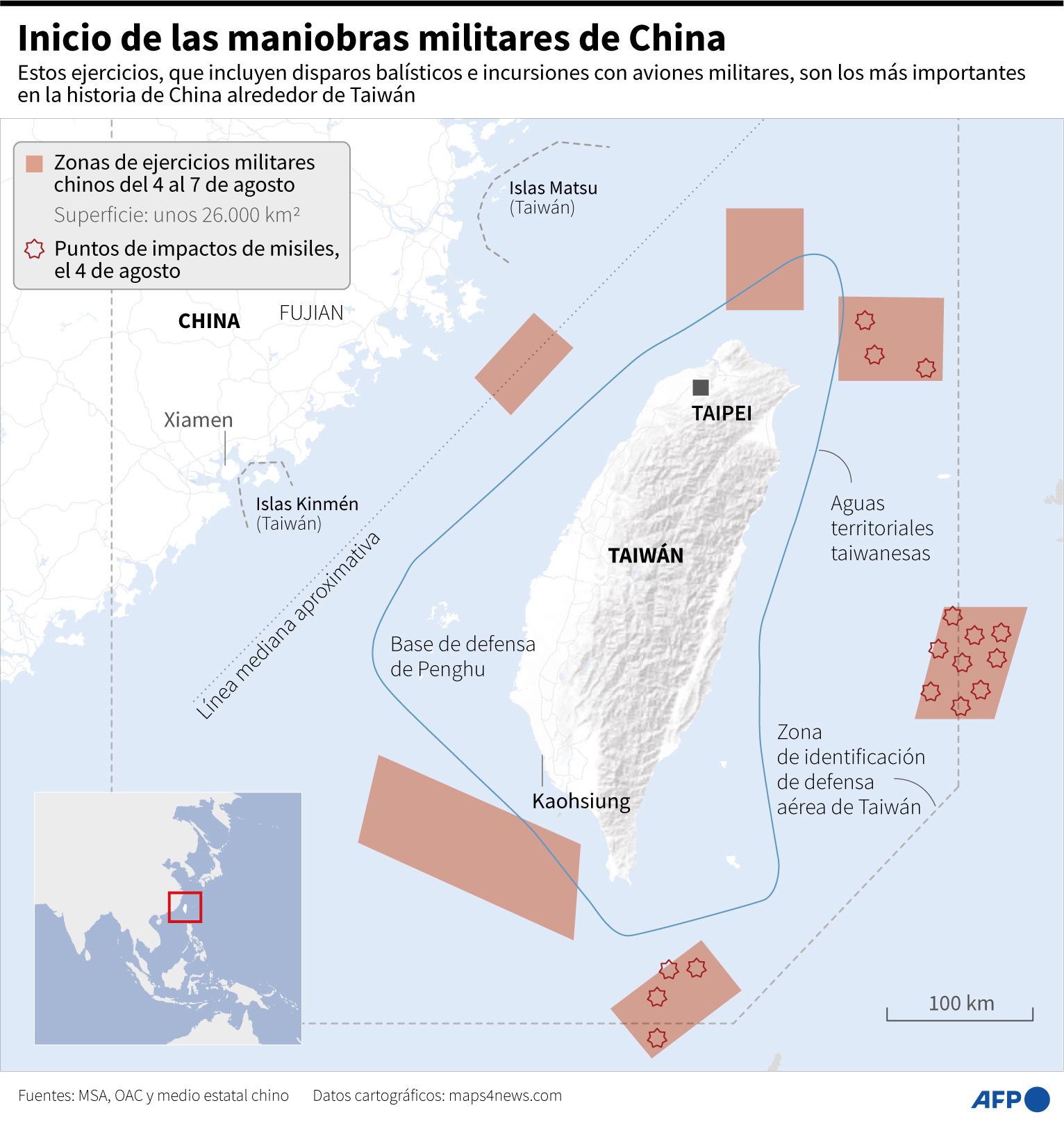 Por su parte, el ministerio taiwanés de Defensa confirmó que el ejército chino había disparado “11 misiles” balísticos de tipo Dongfeng “entre las 13H56 y 16H00 en las aguas del norte, sur y este de Taiwán”.