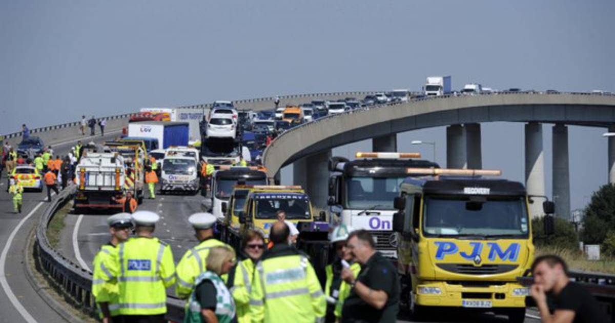 El puente, con cuatro carriles de carretera, une la isla de Sheppey con el condado de Kent, y el accidente se produjo por un choque en cadena de 130 automóviles y camiones.