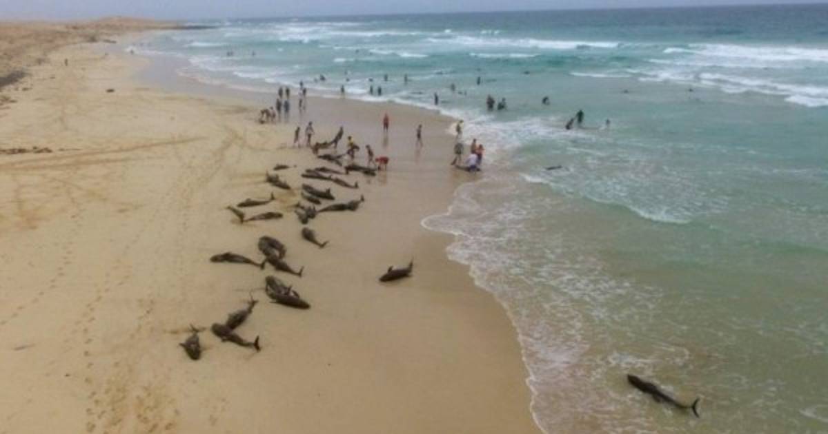 Imágenes espectaculares filmadas por la oenegé BIOS.CV y difundidas en las redes sociales muestran decenas de delfines varados en la arena, o en unos pocos centímetros de agua, a lo largo de cientos de metros de una playa del archipiélago.