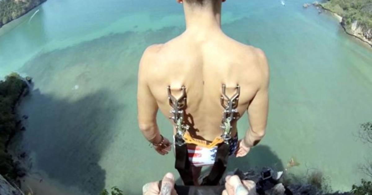 Sí, se metió ganchos dentro de la piel en su espalda. Y luego saltó de un risco en Ton Sai, Tailandia. Es duro con solo ver el video. No obstante, aunque estaba sangrando, dijo que la adrenalina que sintió bloqueó el dolor.