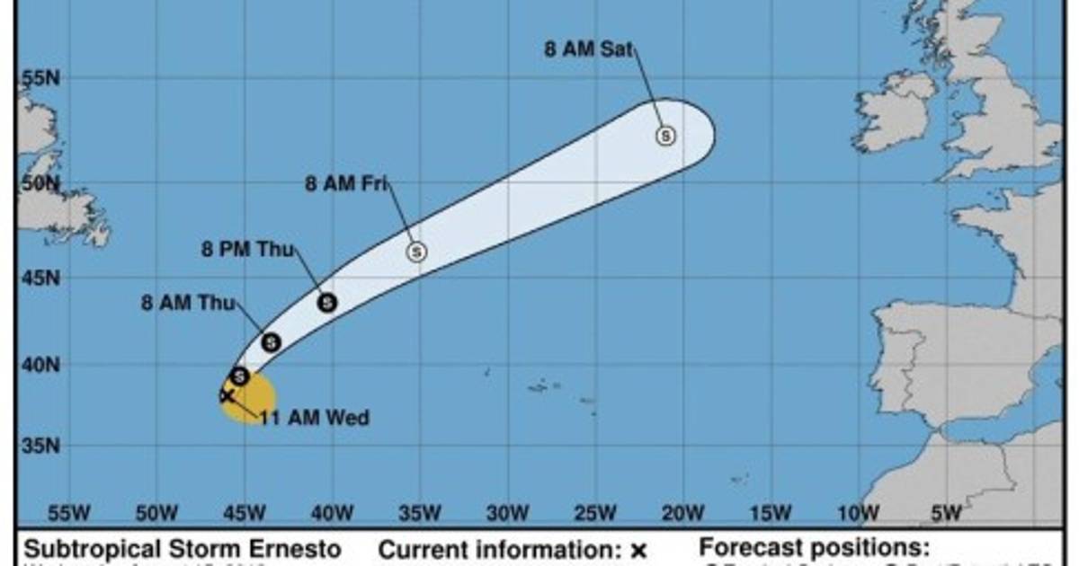 Los expertos del NHC, con sede en Miami, vaticinan un 'fortalecimiento adicional' de Ernesto en las próximas 24 horas para convertirse en un fenómeno postropical en la noche del jueves o temprano en la mañana del viernes.