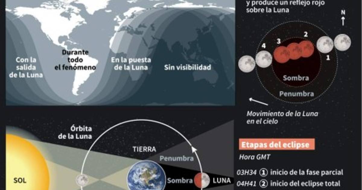 La Luna llena estará en la sombra de la Tierra entre las 03H34 y las 06H51 GMT. Durante la primera hora, será lentamente 'comida' por el costado izquierdo. El eclipse será total durante una hora a partir de las 04H41 GMT, según las tablas de horarios elaboradas por la Nasa.